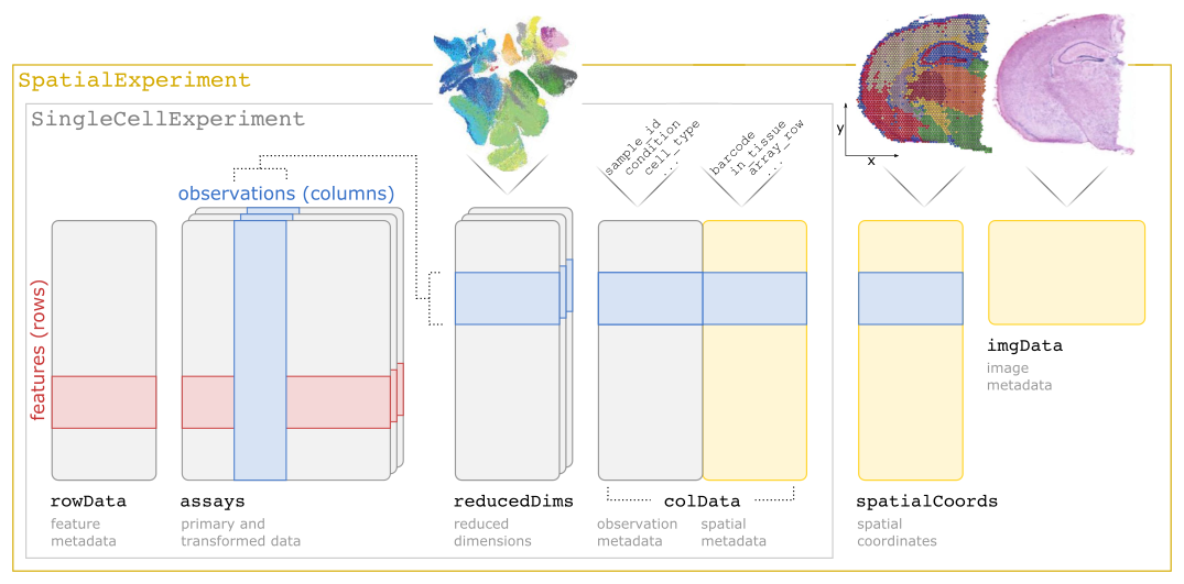 SPE extends SCE with additional customizations to store spatial information, such as spatial coordinates and image files. A schematic of the SpatialExperiment object structure is shown in Figure 3.1. Briefly, a SPE object consists of (i) assays containing expression counts, (ii) rowData containing information on features, i.e. genes, (iii) colData containing information on spots or cells, including non-spatial and spatial metadata, (iv) spatialCoords containing spatial coordinates, and (v) imgData containing image data. For spot-based data, a single assay named counts is used.