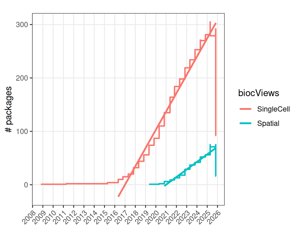Let’s first summarize the number of packages available over time, focusing specifically on “SingleCell” and “Spatial” packages.