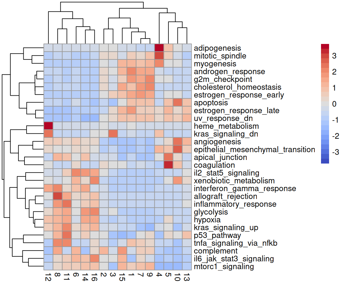 Lastly, we can aggregate signature scores by cell subpopulations. This can help us functionally characterize subpopulations that stem from, e.g., unsupervised approaches or in cases where the cells under study are poorly characterized.