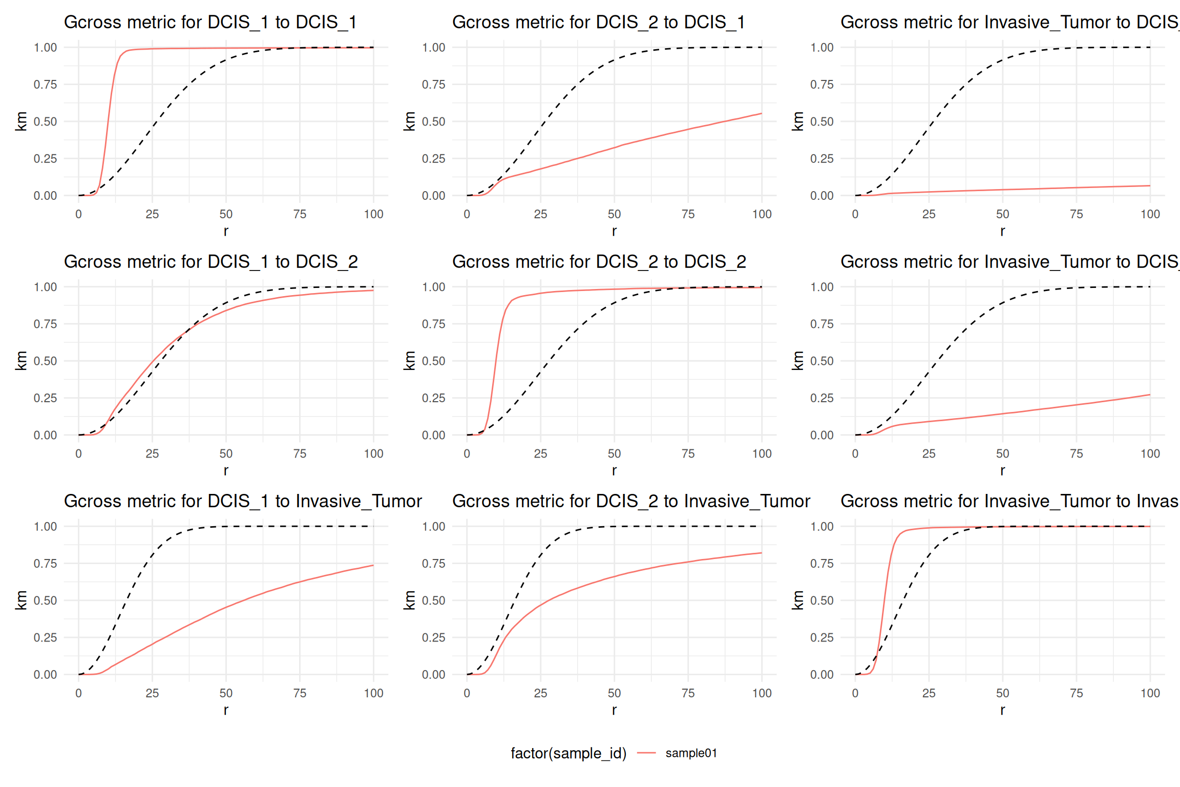 We note that all cell types, ductal carcinoma in situ 1 (DCIS 1), ductal carcinoma in situ 2 (DCIS 2), and invasive tumor cells show a clear interaction among themselves. DCIS 1 and invasive tumor cells show spacing, meaning there are fewer invasive tumor cells found in DCIS 1 than expect under complete spatial randomness (CSR). However, DCIS 2 and invasive tumor cells show a distribution that is completely spatially random in a \(500 µm\)\(r\)-neighborhood.