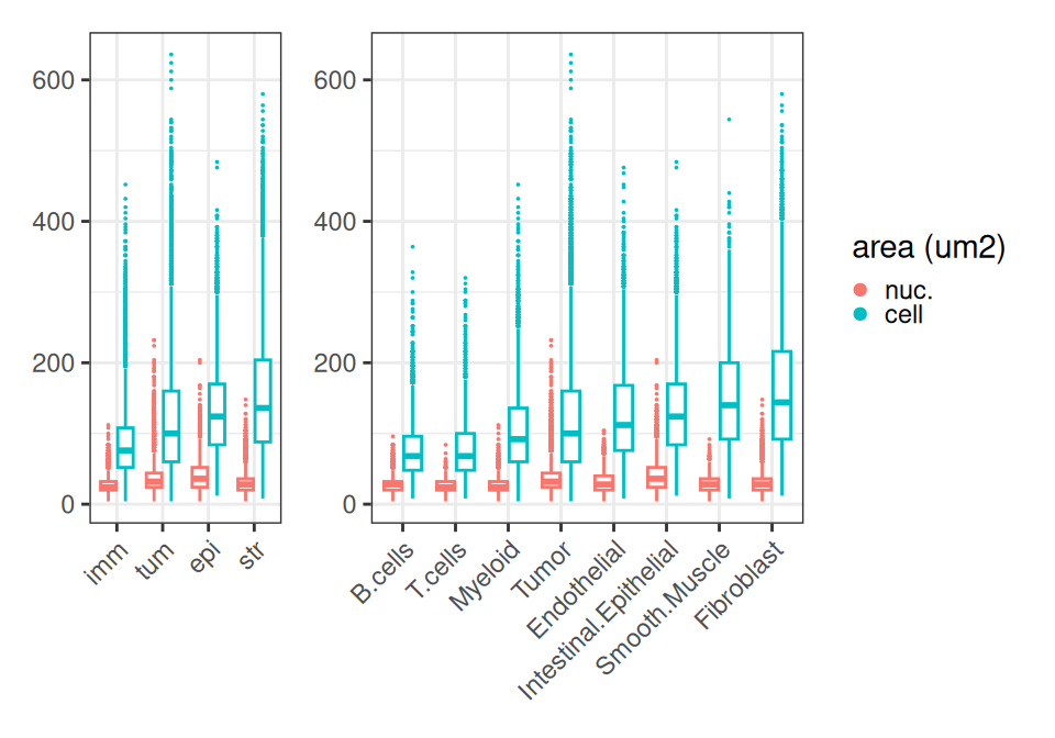 Instead, we quickly inspect how cell and nucleus areas differ across compartments and subpopulations. As expected, immune cells are smallest, tumor and structural cells (epithelial and stromal cells) tend to be larger.
