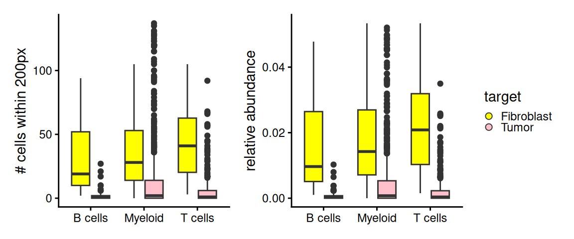 Now, we filter to only T cells, B cells and Myeloid bins, and investigate – within their neighborhood – the spatial proximity differences to Fibroblast or Tumor bins in terms of abundance.