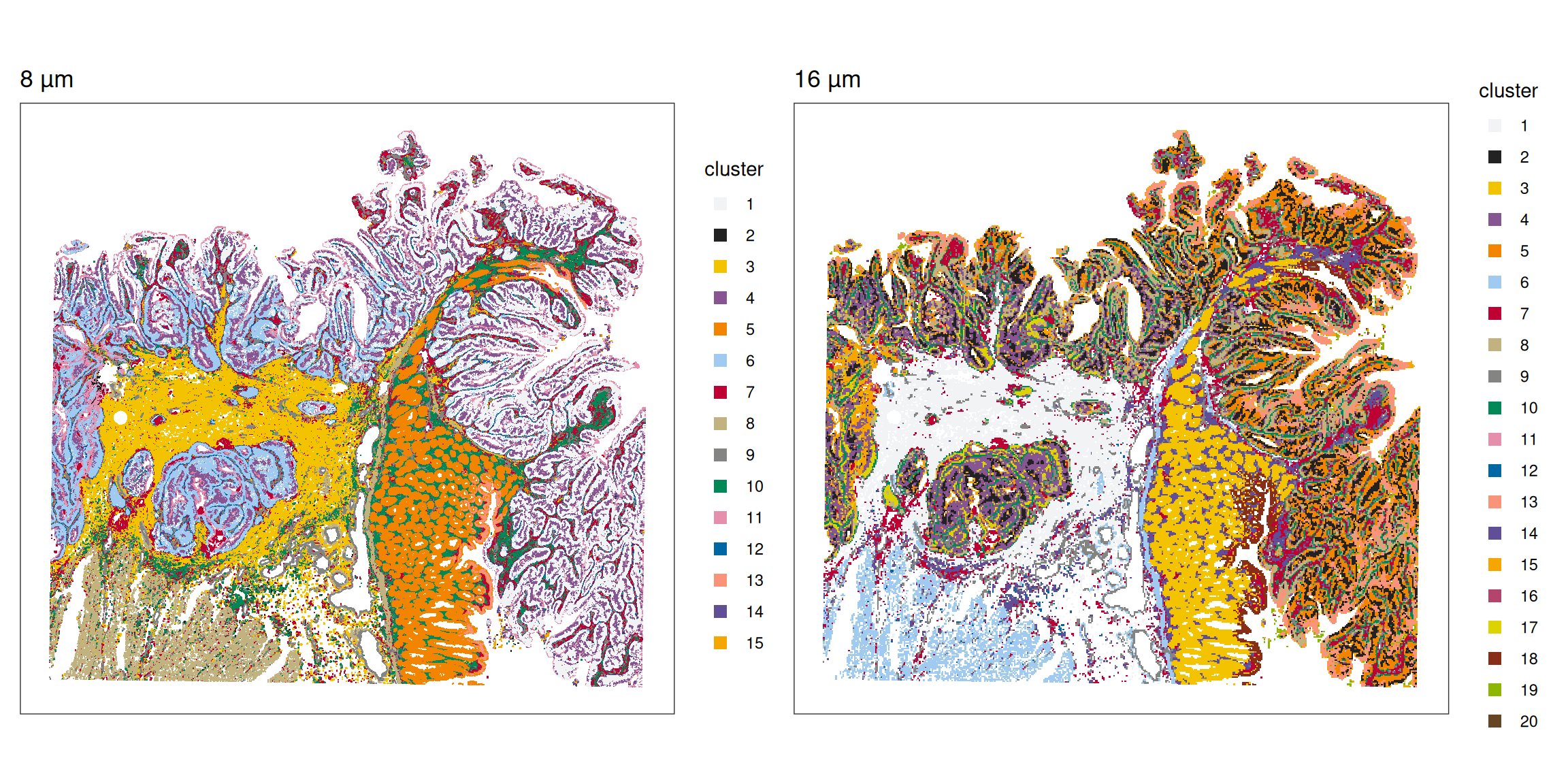 We can visualize the given clustering results at 8 µm and 16 µm resolutions. Later, we will compare the clustering result at 16 µm with that from Banksy.