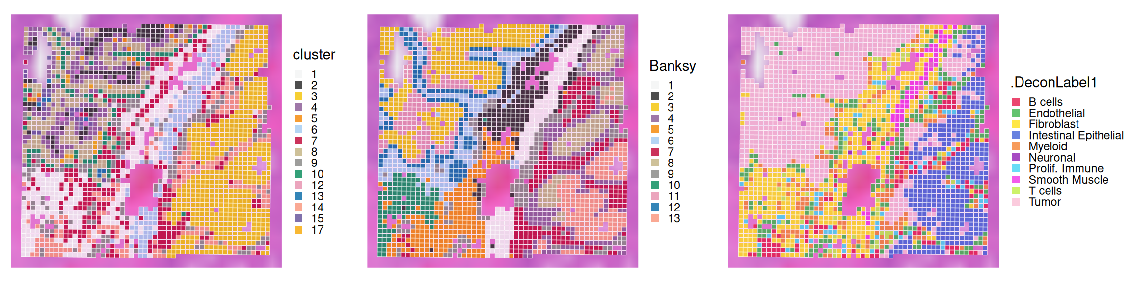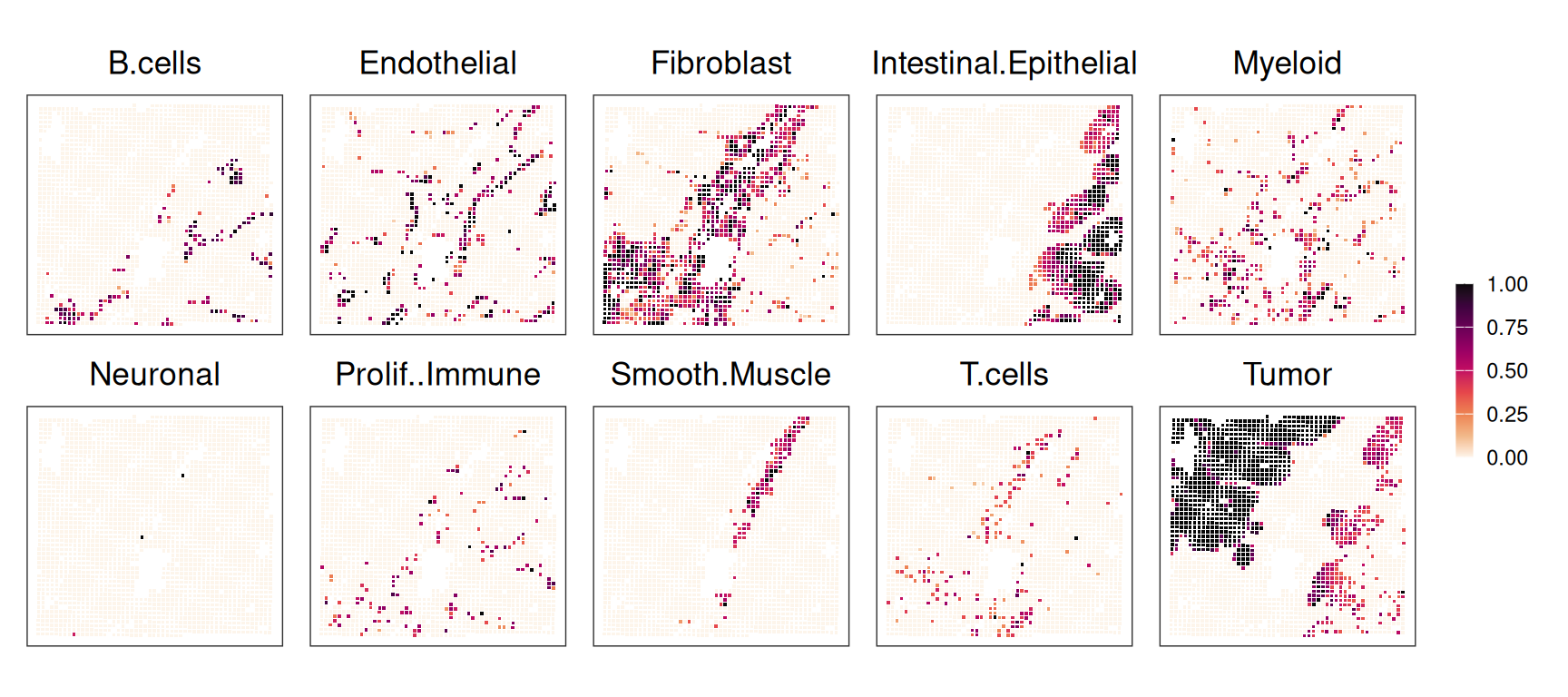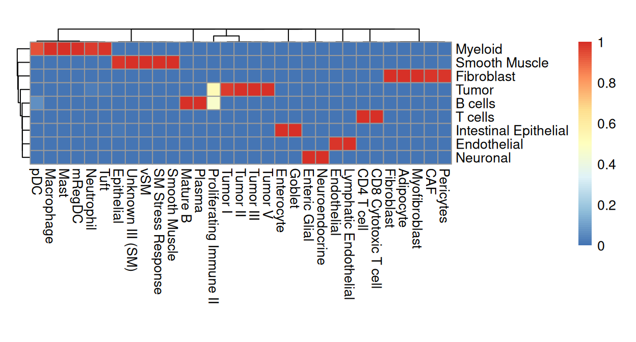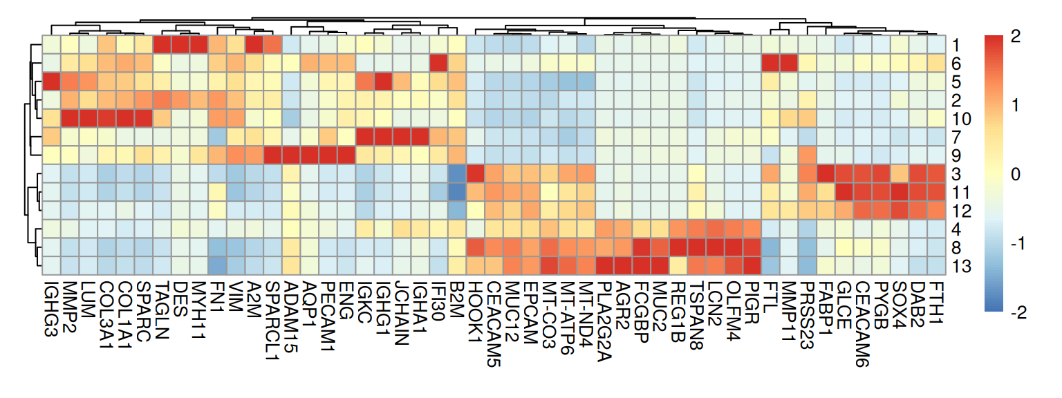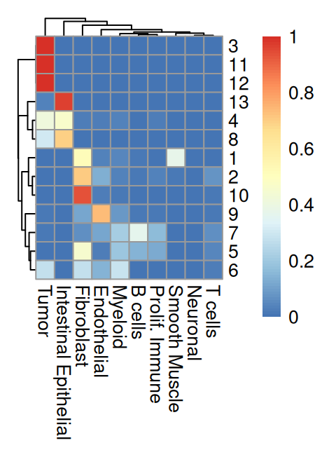 From the above heatmap, cluster 5 and 7 are mostly immune cells; cluster 9 maps to endothelial; cluster 1 and 13 correspond to intestinal epithelial and smooth muscle cells, respectively; fibroblasts map to cluster 10; tumor spans clusters 3, 11 and 12.