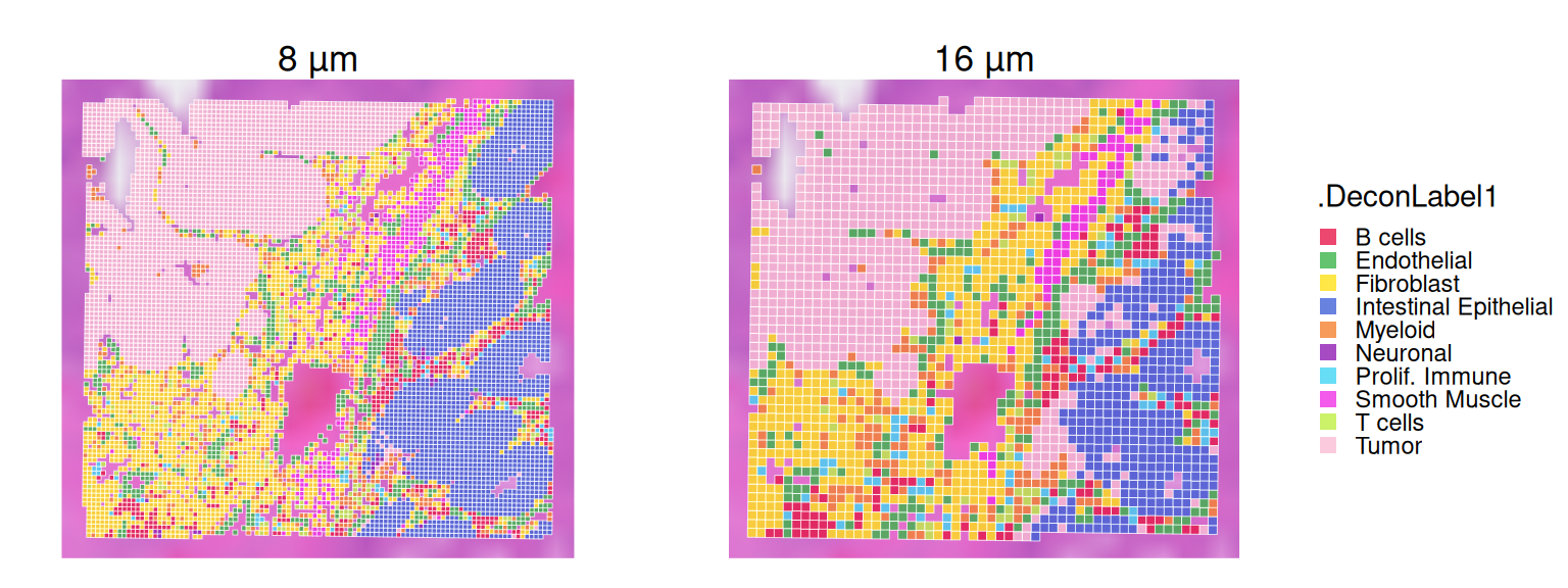 In this demo, we perform deconvolution on 16 µm bins and compare the concordance with results on 8 µm bins, provided by 10x Genomics.