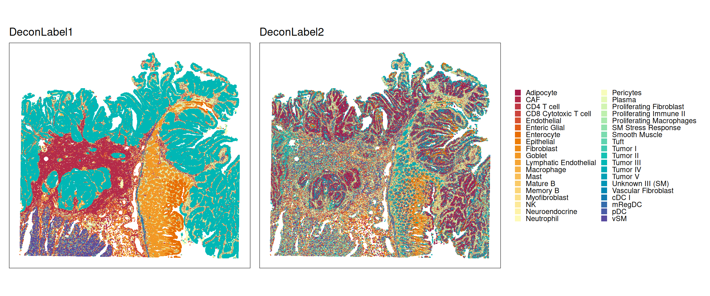 We observe clear agreement in deconvolution at both 8 µm and 16 µm resolutions; however, the 8 µm resolution better captures fine structures, such as the string-like shape of endothelial and fibroblast bins extending into the upper left tumor region.