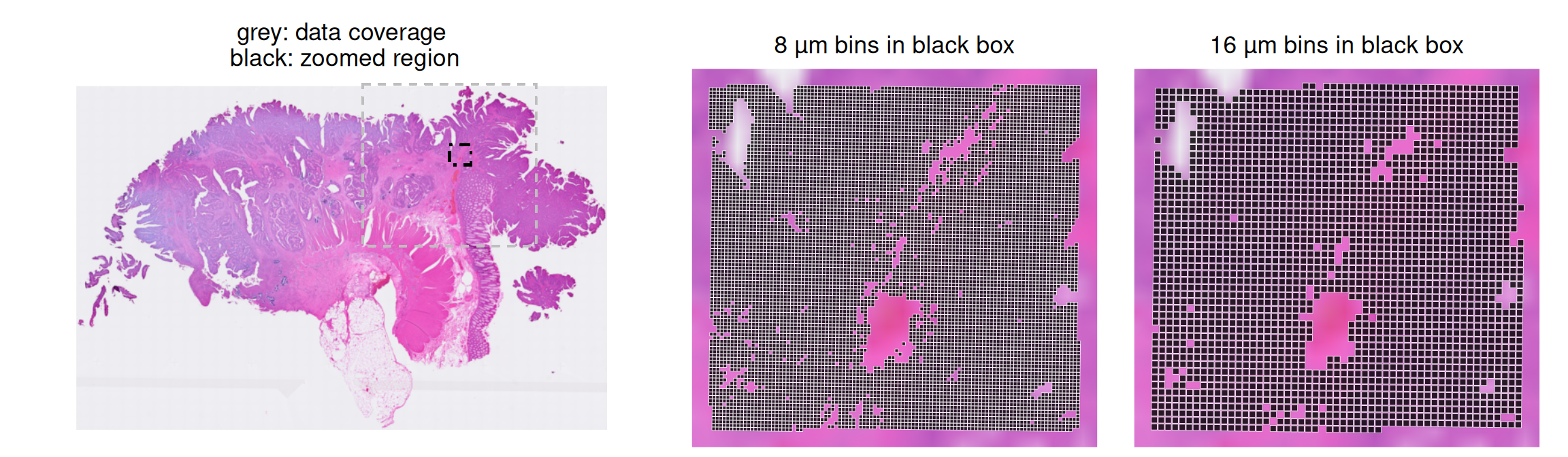 .rng<- \(spe){xy<-spatialCoords(spe)*scaleFactors(spe)xs<-range(xy[, 1]); ys<-nrow(imgRaster(spe))-range(xy[, 2])x1<-xs[1]+4*(xs[2]-xs[1])/8; x2<-xs[2]-3*(xs[2]-xs[1])/8y1<-ys[1]+3*(ys[2]-ys[1])/8; y2<-ys[2]-4*(ys[2]-ys[1])/8list(box=c(x1, x2, y1, y2), cov=c(xs, ys))}vhd8r<-.rng(vhd8)# vhd16r <- .rng(vhd16) # use 8um bounding boxes to subset spes at both resolutions; # it is similar to 16um's box range .box<- \(roi, lty, lwd, col){geom_rect( xmin=vhd8r[[roi]][1], xmax=vhd8r[[roi]][2], ymin=vhd8r[[roi]][3], ymax=vhd8r[[roi]][4], col=col, fill=NA, linetype=lty, linewidth=lwd)}cov<-.box(roi="cov", lty=2, lwd=1/2, col="grey")box<-.box(roi="box", lty=4, lwd=2/3, col="black")# plotting.lim<- \(spe)list(xlim(spe[["box"]][c(1, 2)]),ylim(spe[["box"]][c(4, 3)]))plotVisium(vhd8, spots=FALSE, point_shape=22)+cov+box+ggtitle("grey: data coverage\n black: zoomed region")+plotVisium(vhd8, point_size=0.8, zoom=TRUE, point_shape=22)+.lim(vhd8r)+ggtitle("8 µm bins in black box")+plotVisium(vhd16, point_size=1.6, zoom=TRUE, point_shape=22)+.lim(vhd8r)+ggtitle("16 µm bins in black box")+plot_layout(nrow=1, widths=c(1.5, 1, 1))&facet_null()&theme(plot.title=element_text(hjust=0.5, vjust=0.5))