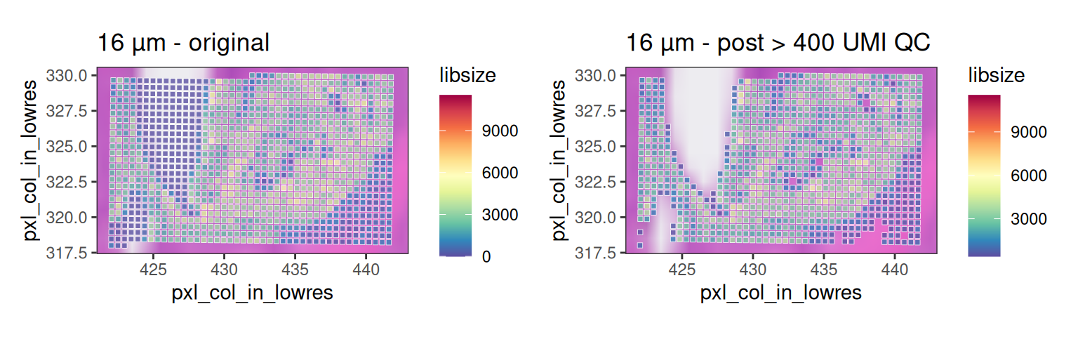 As expected, the number of 8 µm bins is about 4 times the number of 16 µm bins. We will visualize the same subset for both bin sizes in any downstream analyses.