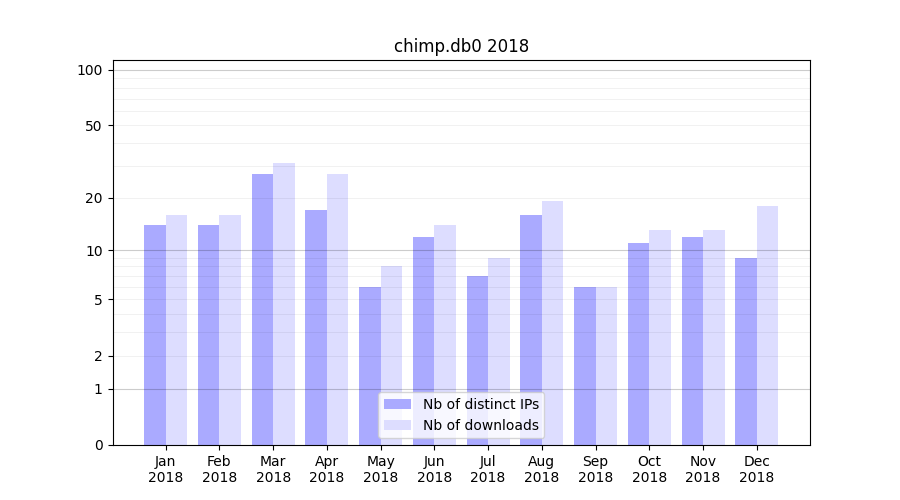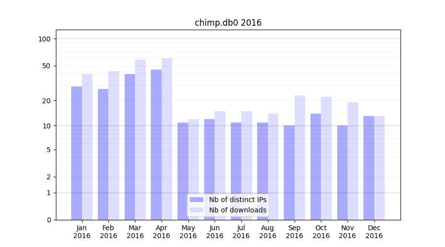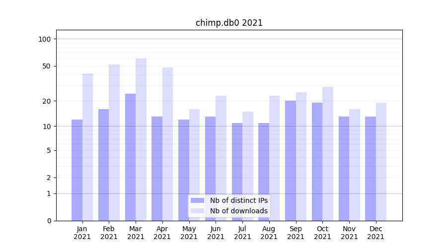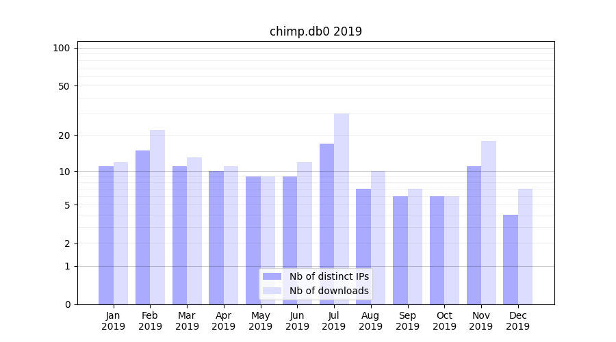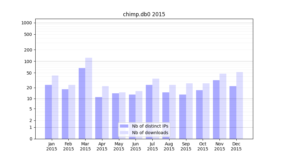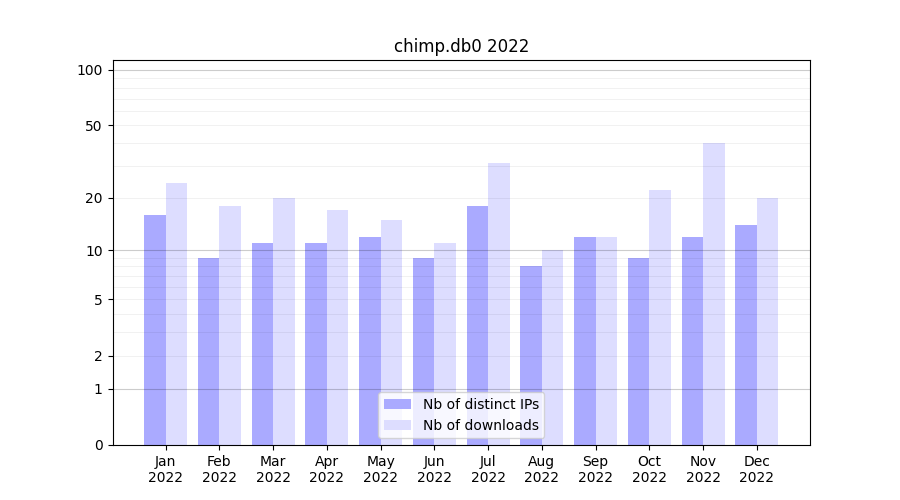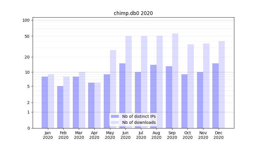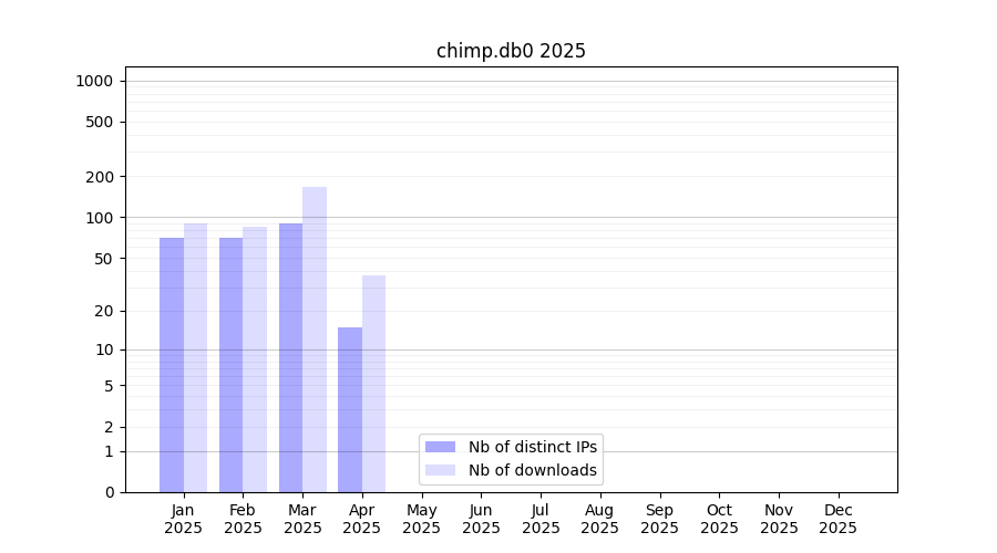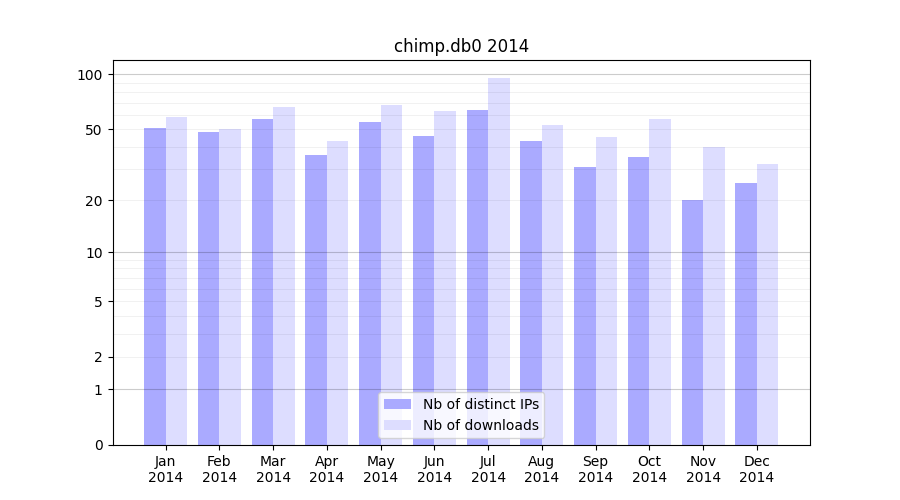 Number of downloads for annotation package chimp.db0, year by year, from 2025 back to 2014 (years with no downloads are omitted):